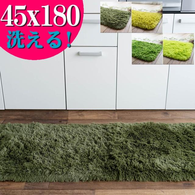 キッチンマット オールシーズン 洗える 送料無料 サラ!ふわ!毛皮のような肌触り! 45×180 毛足35ミリ グリーン シャギーラグ ラグマット 洗濯可 ロングマット 速乾 ムートン 調