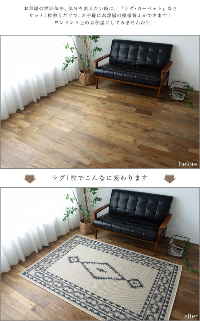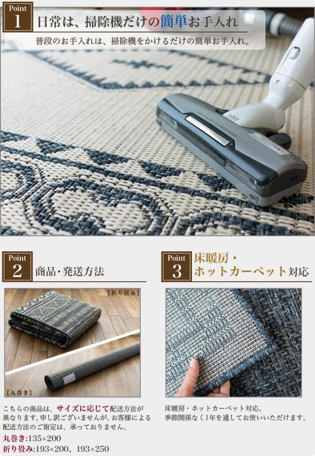 | 【備考】 ※商品によりサイズに多少の誤差があります。 ※カラーはディスプレイ上、実際の色と多少異なる場合がございます。 【こちらの商品の梱包方法】 ・サイズに応じ「折り畳み」「丸巻き」のどちらかで配送いたします。(お客様によるご指定はいただけません) ・開梱時、ラグマット、カーペットの毛並みにムラなどがございますが、使用するにつれ、なくなります ・こちらの商品は気になる遊び毛などは出にくいつくりとなっております ・滑りやすい場所でのご使用は市販のカーペット用の滑り止めネットのご使用をお勧めします ・汚れた場合は、カーペットクリーナー、中性洗剤などを薄め固く絞ったタオルなどで拭き取ってください | |
