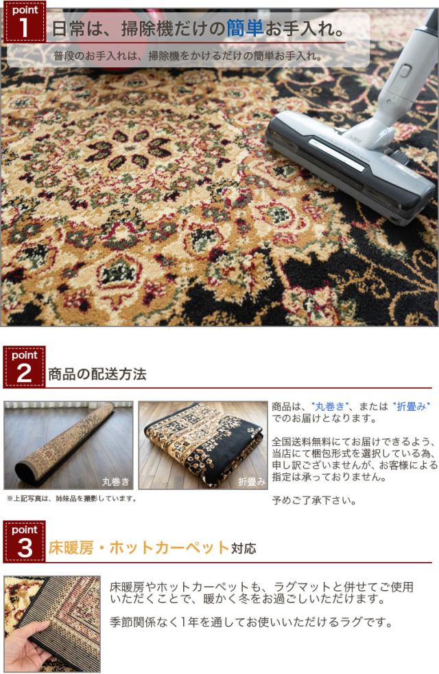 | 【お届け時】 ・「丸巻き」もしくは「折り畳み」:お客様によるご指定はいただけません。 ※こちらの商品は、ご使用当初、裏面に塗られる仕上げの接着塗料の匂いがする場合がございます。常温のもとで気化(蒸発)するため、匂いはご使用につれてなくなります。 ※開梱時、ラグマット、カーペットの毛並みにムラなどがございますが、使用するにつれ、なくなります。 ※商品によりサイズに多少の誤差があります。 ※カラーはディスプレイ上、実際の色と多少異なる場合がございます。 ※こちらの商品は気になる遊び毛などは出にくいつくりとなっております。 ※滑りやすい場所でのご使用は市販のカーペット用の滑り止めネットのご使用をお勧めします。 ※汚れた場合は、カーペットクリーナー、中性洗剤などを薄め固く絞ったタオルなどで拭き取ってください。 | |