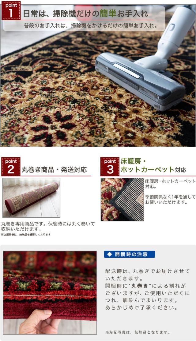 | 【お届け時】 "丸巻き"にてお届けいたします。 ※商品は開梱時、ラグマット、カーペットの毛並みにムラなどがございますが、使用するにつれ、なくなります。 ※商品によりサイズに多少の誤差があります。 ※カラーはディスプレイ上、実際の色と多少異なる場合がございます。 ※こちらの商品は気になる遊び毛などは出にくいつくりとなっております。 ※滑りやすい場所でのご使用は市販のカーペット用の滑り止めネットのご使用をお勧めします。 ※汚れた場合は、カーペットクリーナー、中性洗剤などを薄め固く絞ったタオルなどで拭き取ってください。 | |