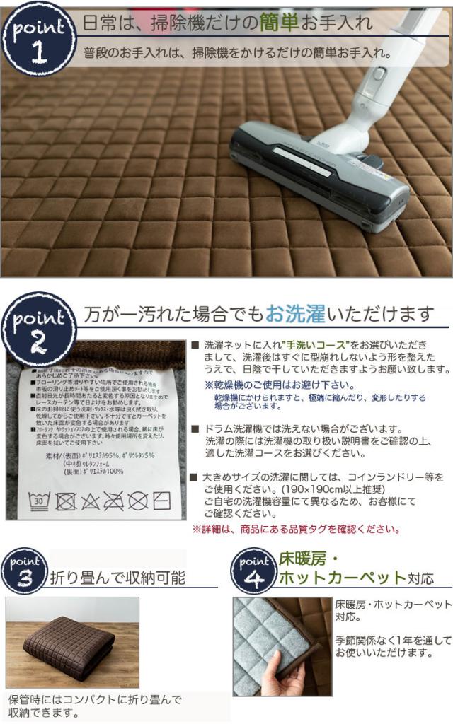 | 【お届け時】 ・折り畳み:全てのサイズが対象 ※商品は開梱時、ラグマット、カーペットの毛並みにムラなどがございますが、使用するにつれ、なくなります。 ※商品によりサイズに多少の誤差があります。 ※カラーはディスプレイ上、実際の色と多少異なる場合がございます。 ※こちらの商品は気になる遊び毛などは出にくいつくりとなっております。 ※滑りやすい場所でのご使用は市販のカーペット用の滑り止めネットのご使用をお勧めします。 ※汚れた場合は、カーペットクリーナー、中性洗剤などを薄め固く絞ったタオルなどで拭き取ってください。 | |