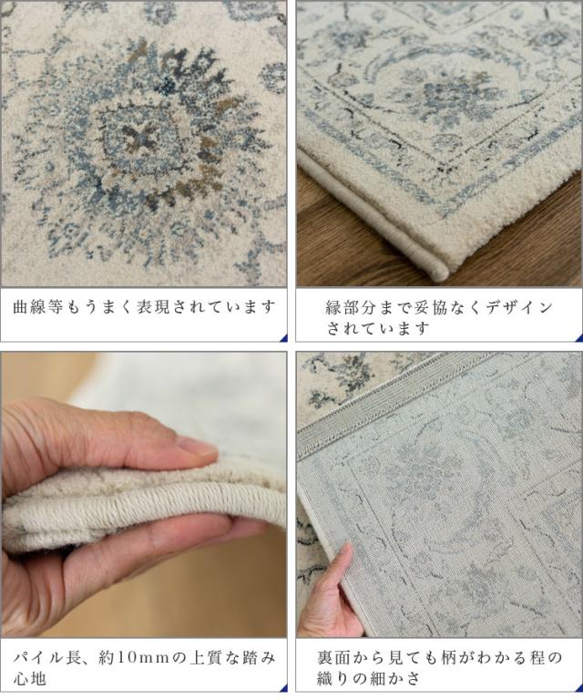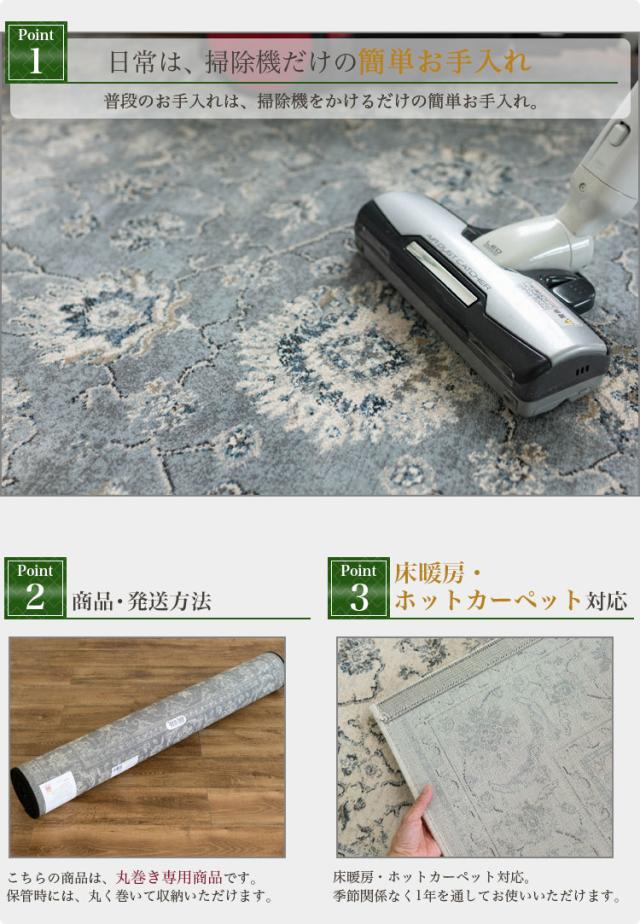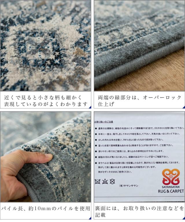 | 【お届け時】 ・丸巻き ※商品は開梱時、ラグマット、カーペットの毛並みにムラなどがございますが、使用するにつれ、なくなります。 ※商品によりサイズに多少の誤差があります。 ※カラーはディスプレイ上、実際の色と多少異なる場合がございます。 ※ウィルトン織りの製法により、使用され、裏面に塗られる仕上げの接着塗料は、ご使用当初、常温のもとで気化( 蒸発 )する、揮発性の匂いがございます。 ※こちらの商品は気になる遊び毛などは出にくいつくりとなっております。 ※滑りやすい場所でのご使用は市販のカーペット用の滑り止めネットのご使用をお勧めします。 ※汚れた場合は、カーペットクリーナー、中性洗剤などを薄め固く絞ったタオルなどで拭き取ってください。 | |