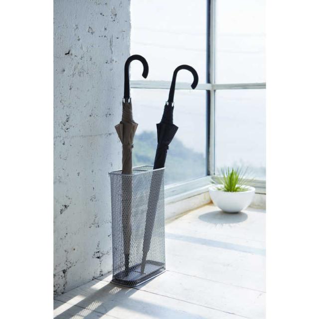 シンプルでクールなメッシュのスリムかさたて。 様々なシーンに合わせやすい、シンプルなデザイン。メッシュ素材なので、通気性が良く、収納物が一目で分かるようになっています。玄関の角に収まるコンパクト設計
