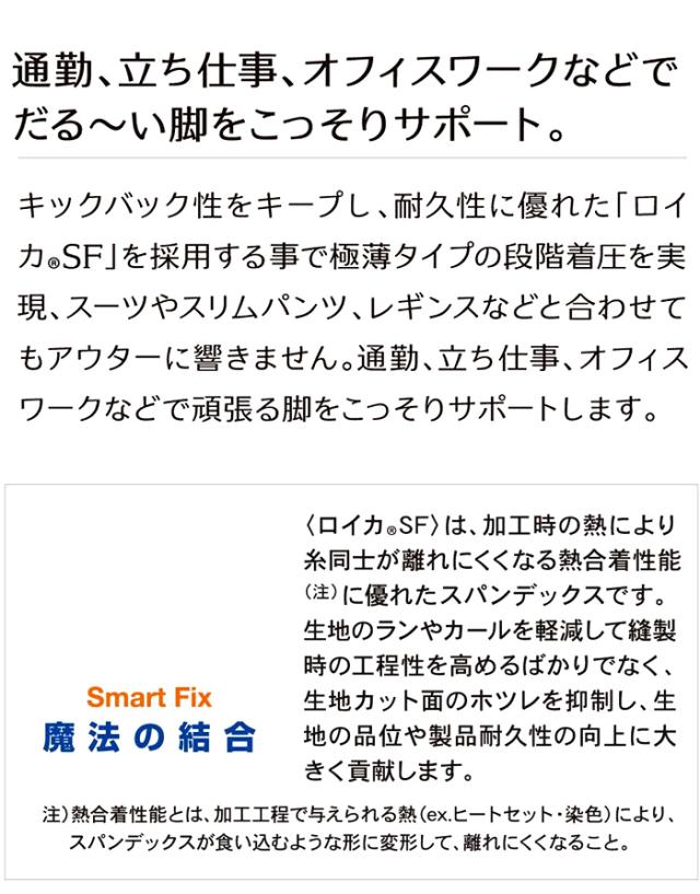 キックバック性をキープし、耐久性に優れた「ロイカ(R)SF」を採用する事で極薄タイプの段階着圧を実現。
