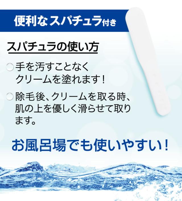 便利なスパチュラ付きで手を汚すことなく除毛クリームの塗布、拭き取りが可能です。