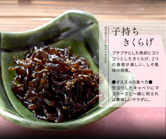 - 子持ち昆布佃煮のような味付けの佃煮です。きくらげなので昆布よりも歯ごたえがあり、あっさりしています。 この商品はリピート買いしています。