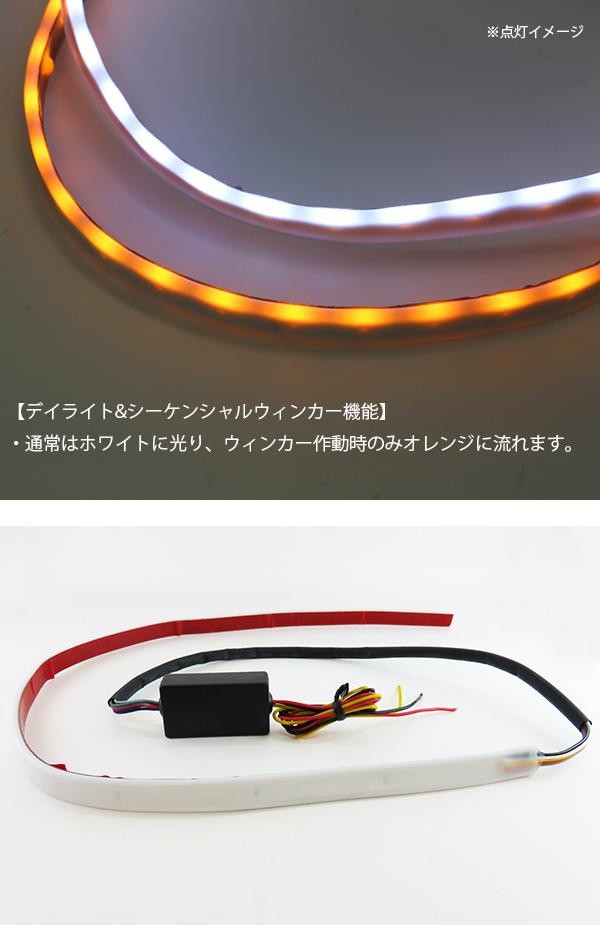 | 仕様 | デイライト&シーケンシャルウィンカー機能 36SMD使用(片側) LEDカラー:ホワイト、アンバー(オレンジ) 防水性に優れたシリコンテープ採用 DC12V専用 明るさ:300〜360lm ワット数:5.76W |
