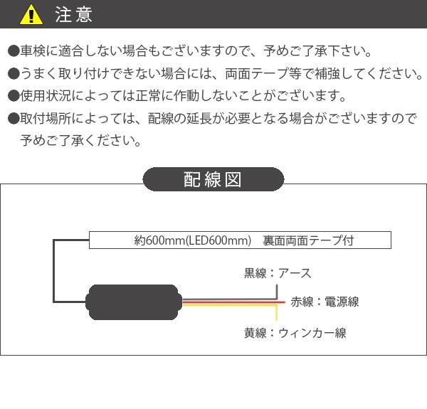 通常はホワイトに光り、ウインカー作動時のみオレンジ光が左から右に流れます。5cm間隔で自由にカット可能です。裏面に両面テープが付いています。 |
