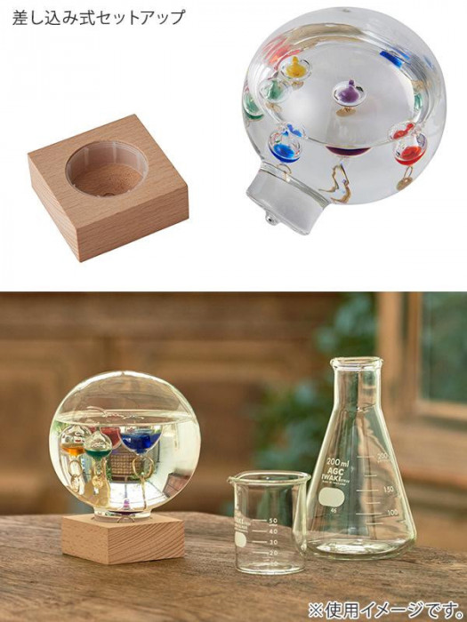 商品詳細:ガリレオ・ガリレイが発見した、液体の比重が温度によって変化する原理を使って作られた温度計です。ガラス球が温度によって上下します。インテリアとして、置くだけでも目を楽しませてくれる温度計です。 生産国:中国 素材・材質:ホウケイ酸ガラス、パラフィンオイル、天然木(ビーチ材)他 商品サイズ:高さ120×幅100×奥行100mm(スタンド含む) 重量:430g 仕様:差し込み式セットアップ測定可能範囲:18度~26度ガラス球体5個パッケージ:茶ダンボール箱