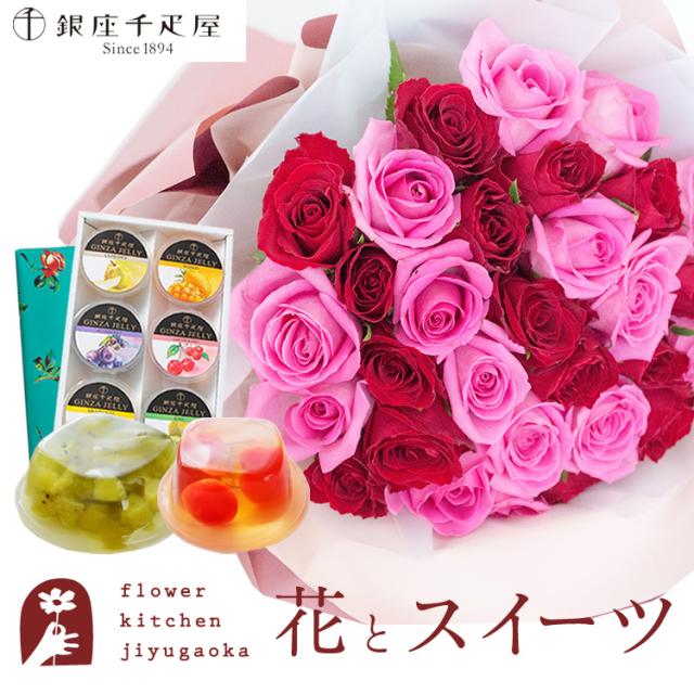 花とスイーツのセット 30本バラ花束と【銀座千疋屋】銀座ゼリー6個入りセット プレゼント 誕生日 記念日 お祝い花 即日発送 あすつく FKAA