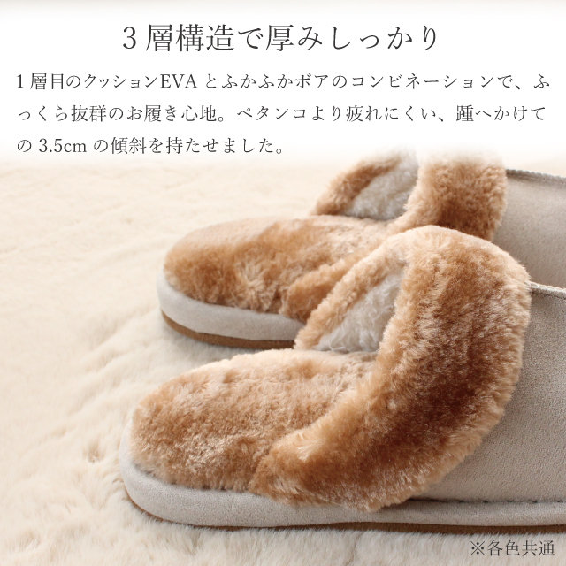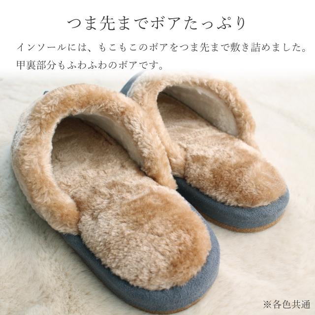 ■特徴 ボアの量が通常品の2倍程度で、3層構造の踵がふかふかな履き心地です。