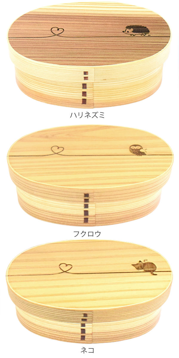 かわいい動物のレーザー彫刻が施された曲げわっぱ弁当箱