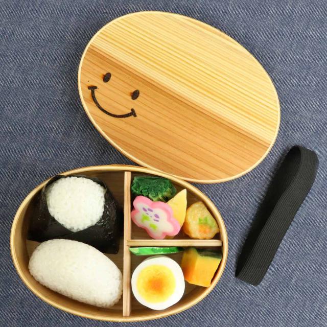 弁当箱 曲げわっぱ 600ml 1段 ウレタン塗装 レーザー彫刻 デザイン スマイル ( お弁当箱 ランチボックス 一段 木製 まげわっぱ 女子 わっぱ 弁当 お弁当 小判型 仕切り付き ゴムバンド付き 日本製 大人 女性 )