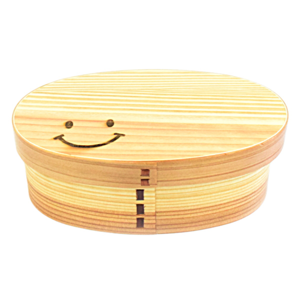 スマイルのレーザー彫刻が施された曲げわっぱ弁当箱
