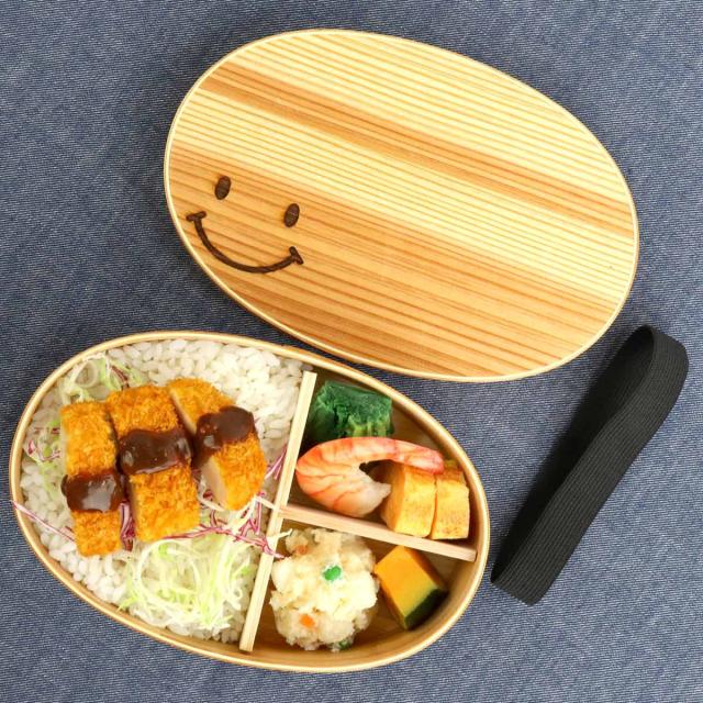 弁当箱 曲げわっぱ 700ml 1段 ウレタン塗装 レーザー彫刻 デザイン スマイル ( お弁当箱 ランチボックス 一段 木製 まげわっぱ 女子 わっぱ 弁当 お弁当 小判型 仕切り付き ゴムバンド付き 日本製 大人 女性 )