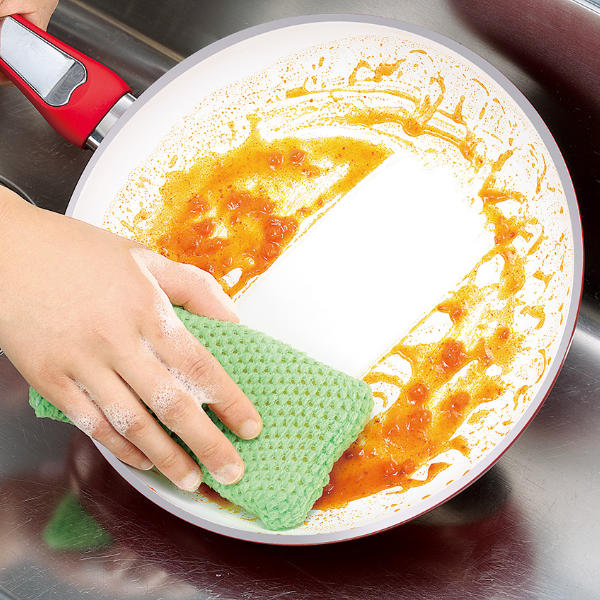 セラミックコーティングの優れたこびりつきにくさにより、少量の中性洗剤を付けたスポンジでサッと擦るだけで、汚れが簡単に取れます。
