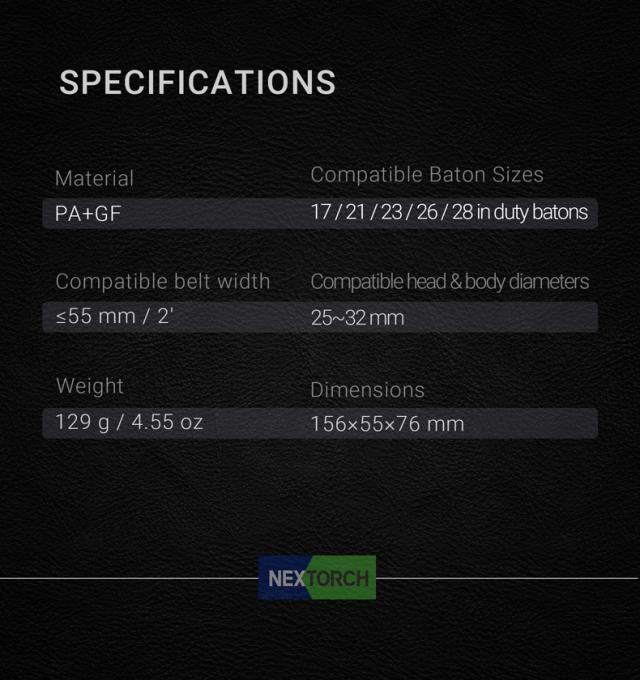 バトンホルダーとベルトマウントは着脱も可能です。バトンホルダーはNEXバトン以外にも他社メーカーのデューティバトンの使用を可能にします。サイドスクリューを回して使用するバトンの直径に合わせます。調節幅範囲(25 - 32mm) V73ホルスターは下記のフラッシュライトのホルスターとしても使用が可能です。 ヘッド幅:25 - 32mm 、TA30、TA15、TA01、E6、E51、V2.0 ボディ幅:25 - 32mm 、P80、TA30、MAX、T7L、PA5、TA40、P5G PA+GF素材を使用したV73ホルスターは錆びにくく、過酷な環境で使用しても経年劣化が遅くなります。さらに軽量で持ち運びも簡単です。 バトンの先端チップがホルスター底にロックされることで、バトンを引き抜くときに自動的にバトンが伸びるように出来ています。NEXクイック17 / 21 / 23インチのバトンに使用出来ます。ホルスターにはバトンの直径に合わせることが出来る調節ネジが付いていますのでホルスター上部のグリップ力はバツグンに良くなります。 ● 材質:ポリアミド & ファイバーグラス ● 使用可能なバトンサイズ :17/21/23/26/28 (NEX DUTY BATON) ● 使用可能なベルト幅:55 mm 以下 ● 使用可能なヘッド直径:25 - 32mm ● 重量:129g ● 製品サイズ:156 x 55 x 76mm |