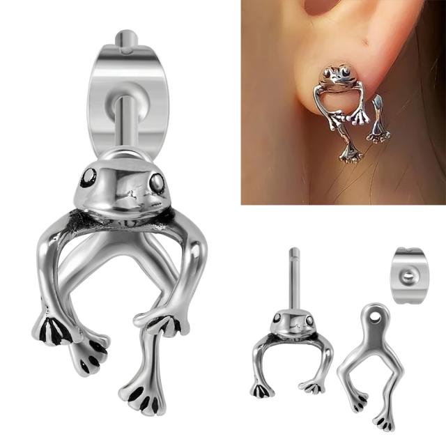 蛙の頭のピアスに蛙の胴体のチャームを通した立体的でユニークなバックキャッチタイプのステンレスピアス。