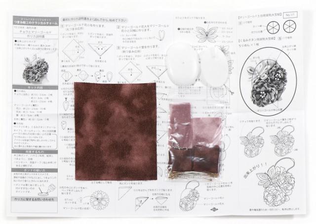 | セット内容 | ちりめんカット布各種、ペップ、くるみボタン(チャームタイプ)、ボールチェーン、作り方説明書 |