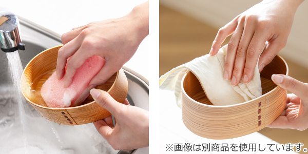 使用後は中性洗剤を使用し、柔らかいスポンジで洗ってください。漆またはウレタン塗装によりコーティングされていますのでさっと布巾で拭いていただき、その後しっかりと乾燥させてください。