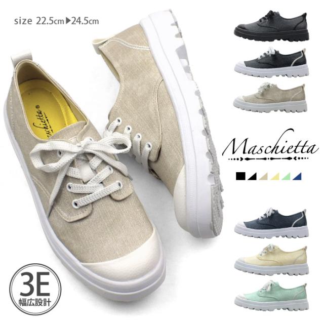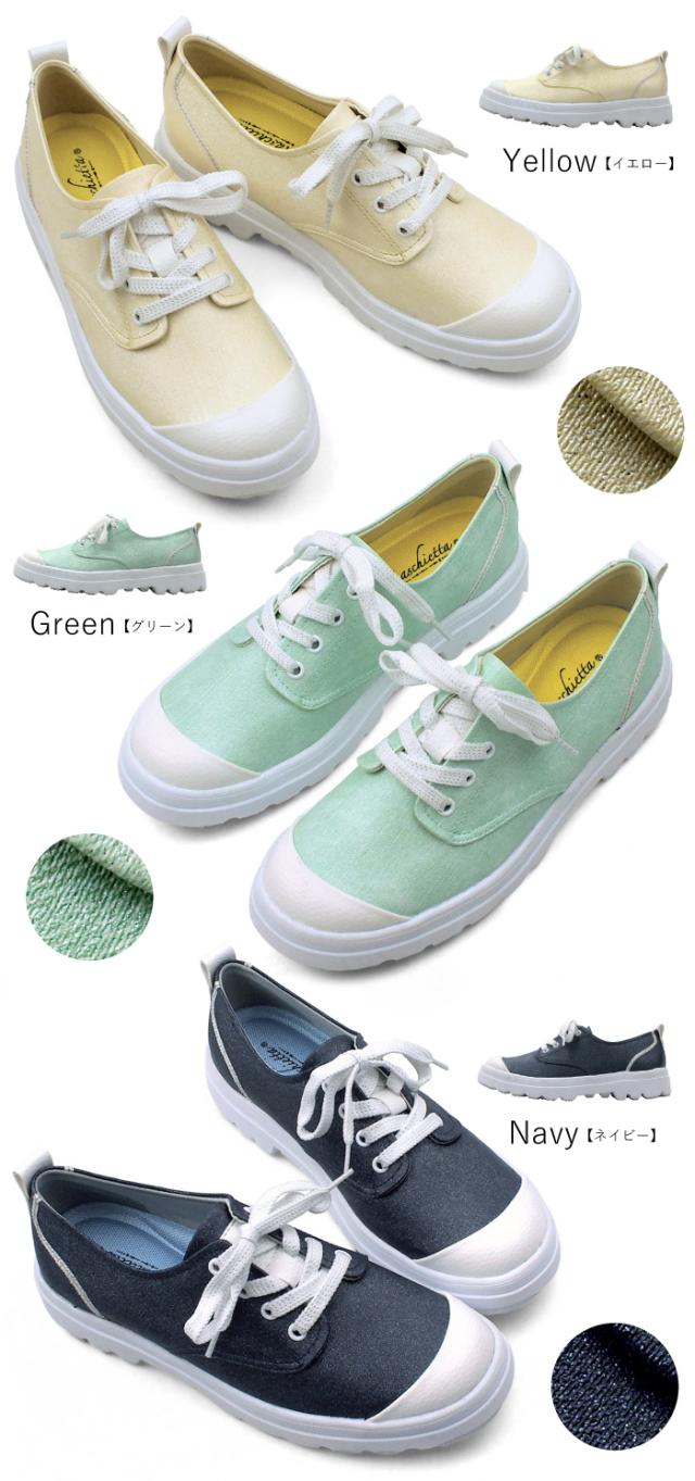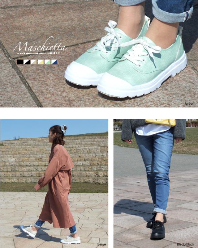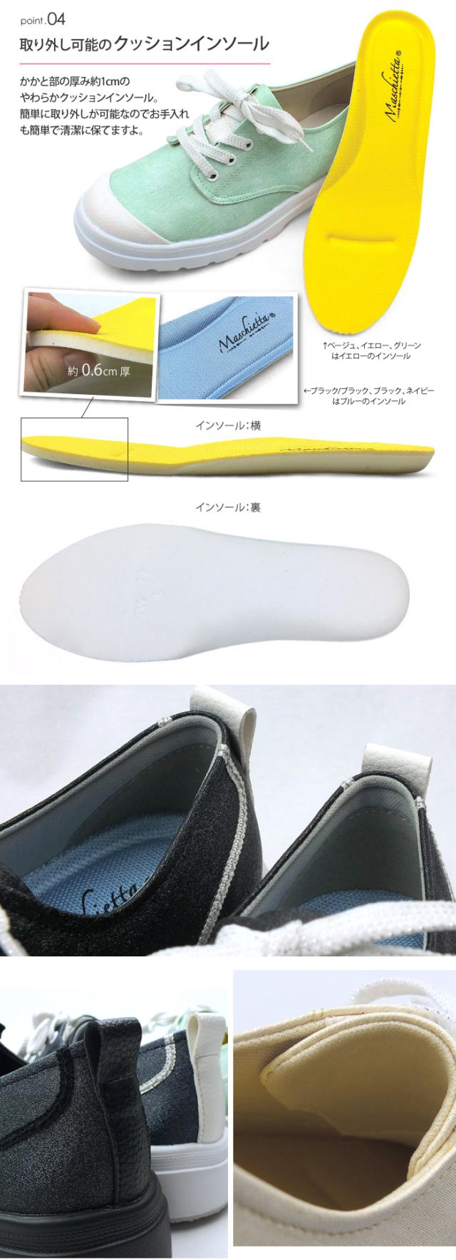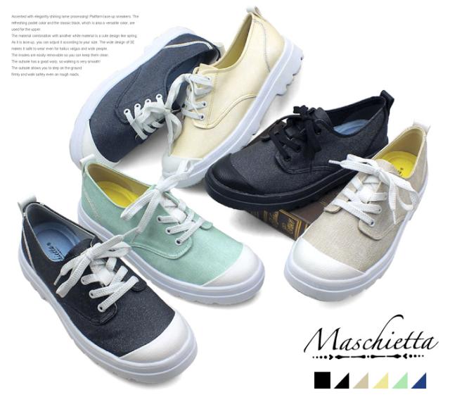 maschietta-マスチェッタ-上品に光るラメ加工がアクセント!厚底レースアップスニーカーさわやかなパステルカラーに万能カラーでもある定番ブラックをアッパーに採用。白色の別素材との素材コンビが春らしくかわいいデザインです。レースアップなので自分サイズに合わせて調節可能。3Eの幅広設計で外反母趾や幅広の方でも安心してお履き頂けます。インソールは簡単に取り外し可能なのでに清潔に保てますよ。反りの良いアウトソールなので歩行がとても滑らか!アウトソールは地面をしっかりと踏みしめえれれ悪路でも安心して歩けます。ブラック&ブラック/ブラック/ベージュ/イエロー/グリーン/ネイビー/ の6色のカラーバリエーション