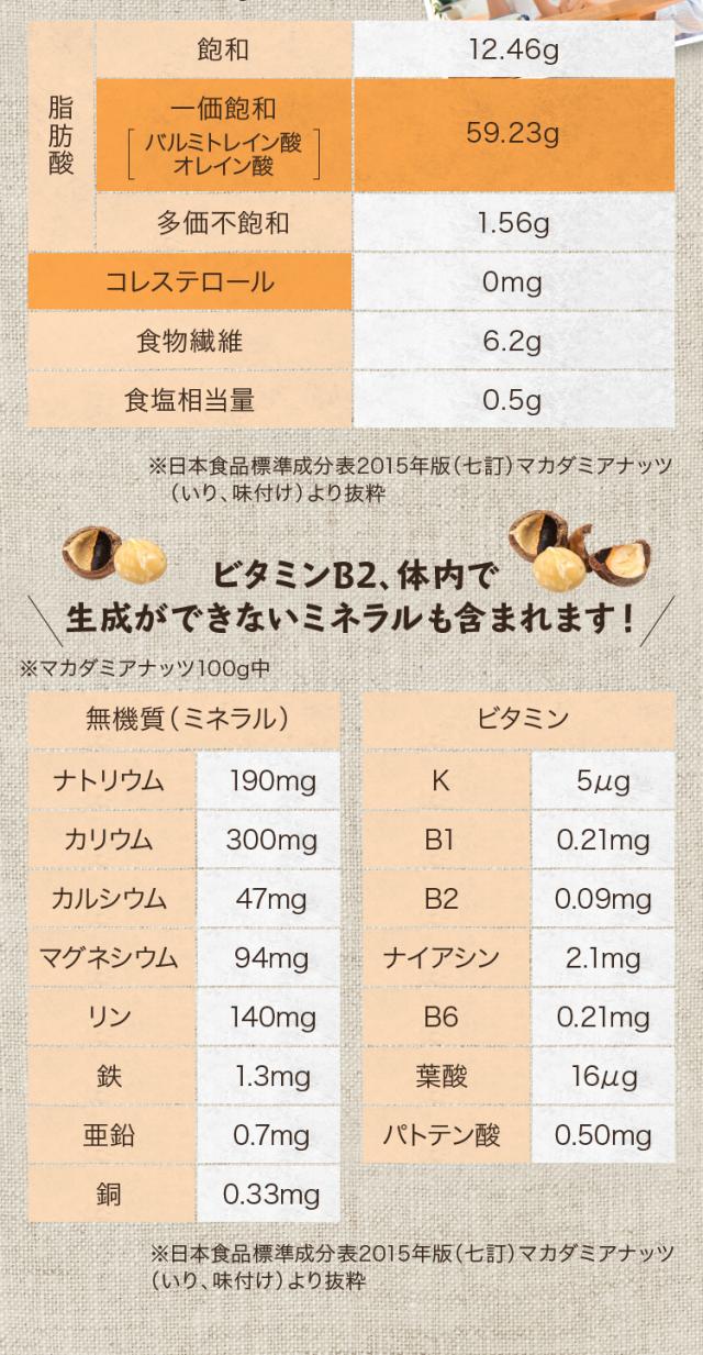 マカダミアナッツには、ビタミンやミネラル、さらには「体に良い油」と言われる不飽和脂肪酸などの栄養成分が豊富に含まれています。