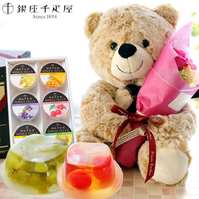 花とスイーツ くまのマックス&フェアリーブーケ と 【銀座千疋屋】銀座ゼリー6個入りセット ギフトセット 誕生日 記念日 お祝い花 即日発送 あすつく FKTPH