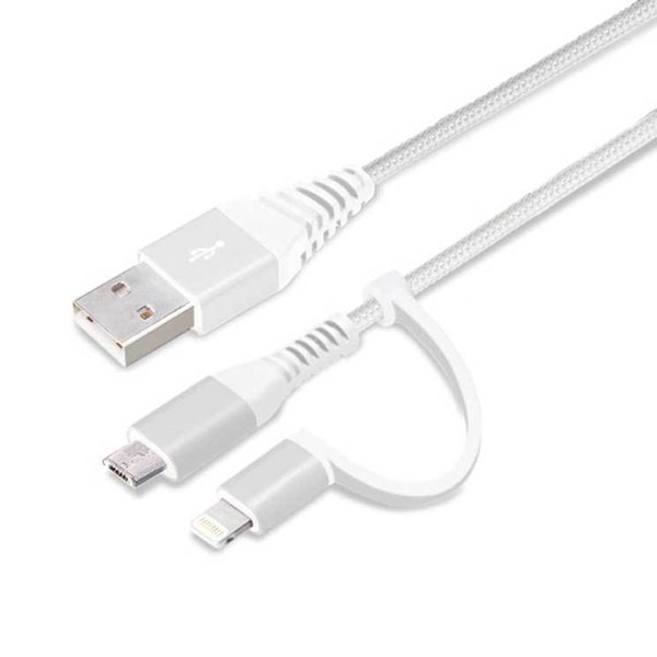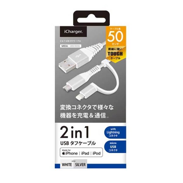 iPhone ケーブル 50cm ホワイト&シルバー Lightning micro USB 変換コネクタ付き 2in1 USB スマホ スマートフォン PGA