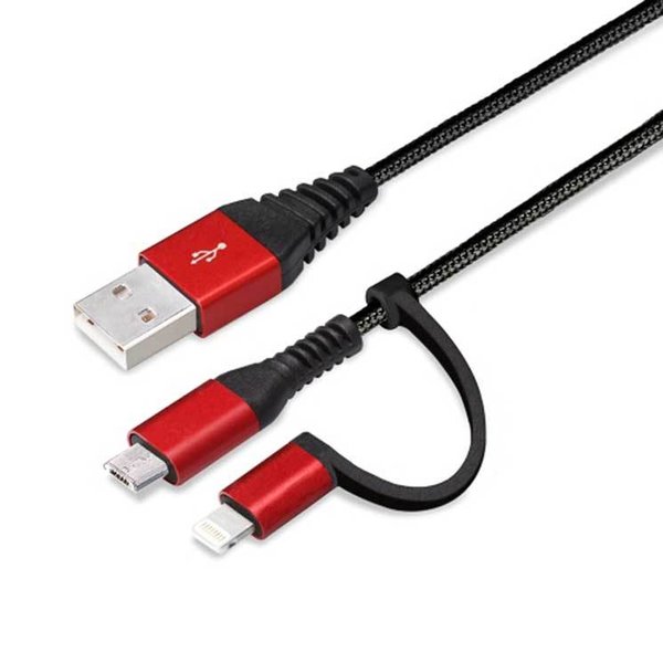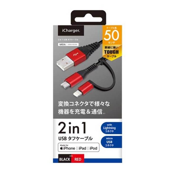 iPhone ケーブル 50cm レッド&ブラック Lightning micro USB 変換コネクタ付き 2in1 USB スマホ スマートフォン PGA