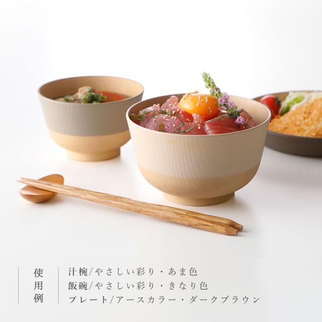 天然木のようなぬくもりとやさしい色合いが魅力の、抗菌仕様お椀。日本伝統色を活かした「やさしい彩り」シリーズの汁椀は、軽くて割れにくい樹脂製ながら、上品な木目調の風合いを再現しています。