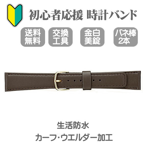 初心者応援 時計ベルト 時計バンド 革バンド 交換工具 スペア美錠 バネ棒付 時計際幅 18mm カーフ 茶 日常生活防水 ウエルダー加工