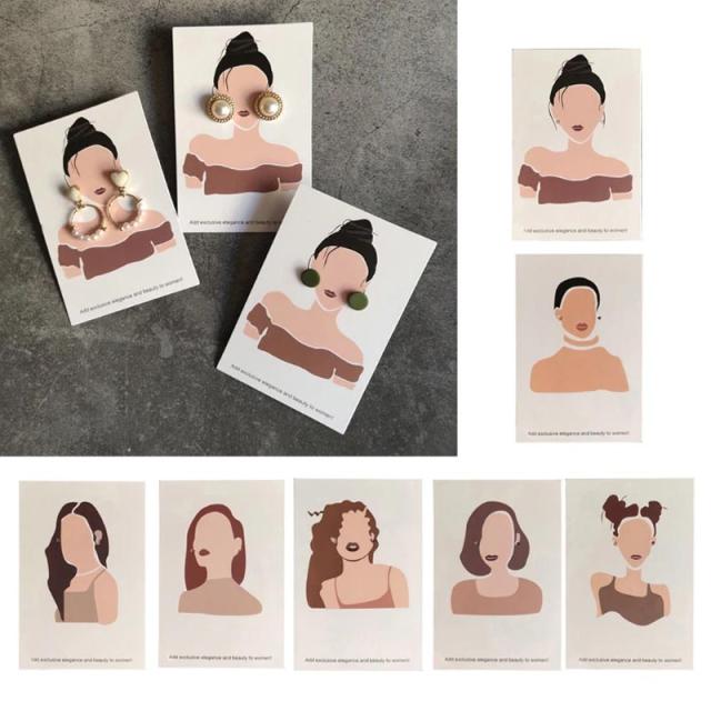白い紙の台紙にいろいろなヘアスタイルや髪形、メイクをした女性をデザインした台紙に2個の穴をあけたピアス台紙。スタッドピアス、キャッチピアス、フックピアスをディスプレイするのに適した紙でできたペーパータグ。
