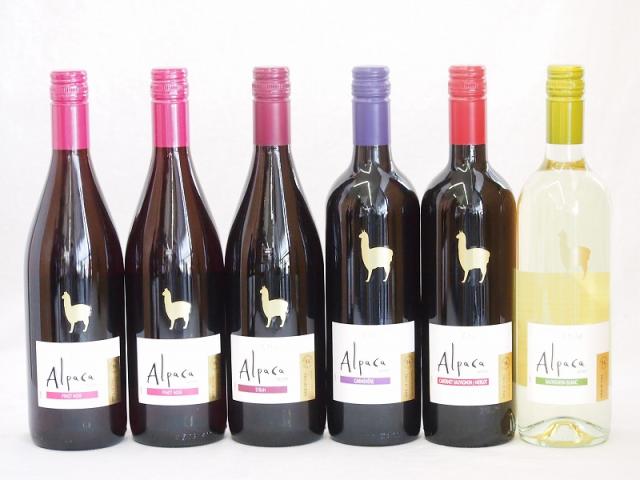 チリ産ワインアルパカ6本セット(赤ピノ・ノワール(ミディアムボディ) 赤シラー(フルボディ) 赤カルメネール(フルボディ) 赤カベルネ・メルロー(ミディアムボディ) 白ソーヴィニヨン・ブラン(辛口)) 750ml×6本