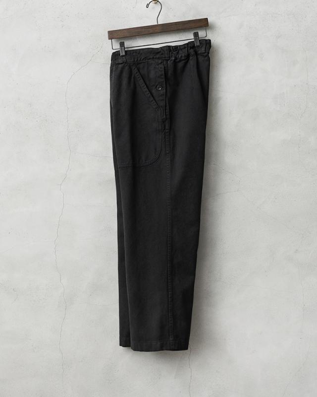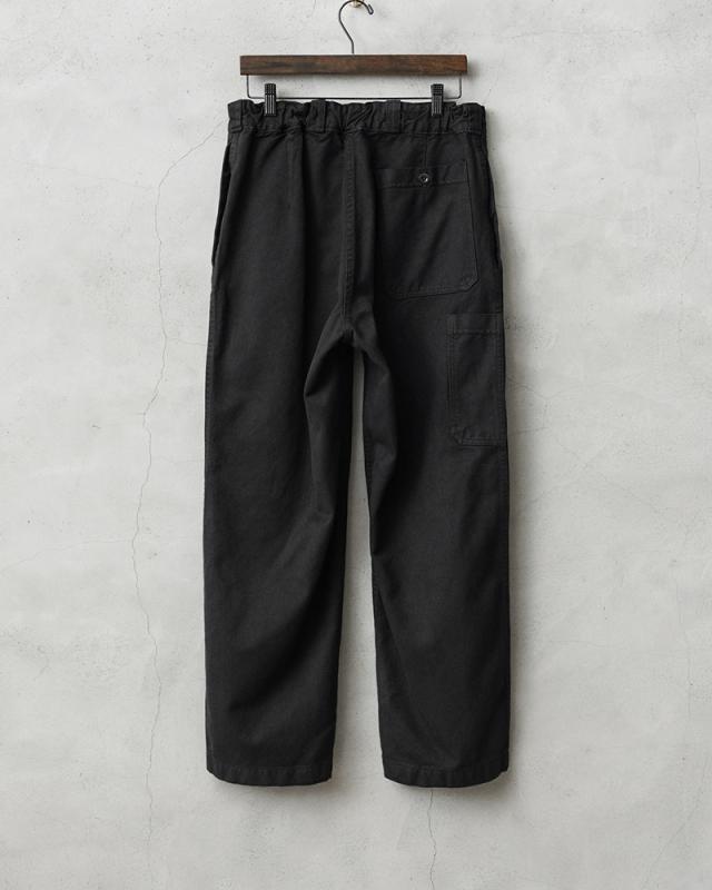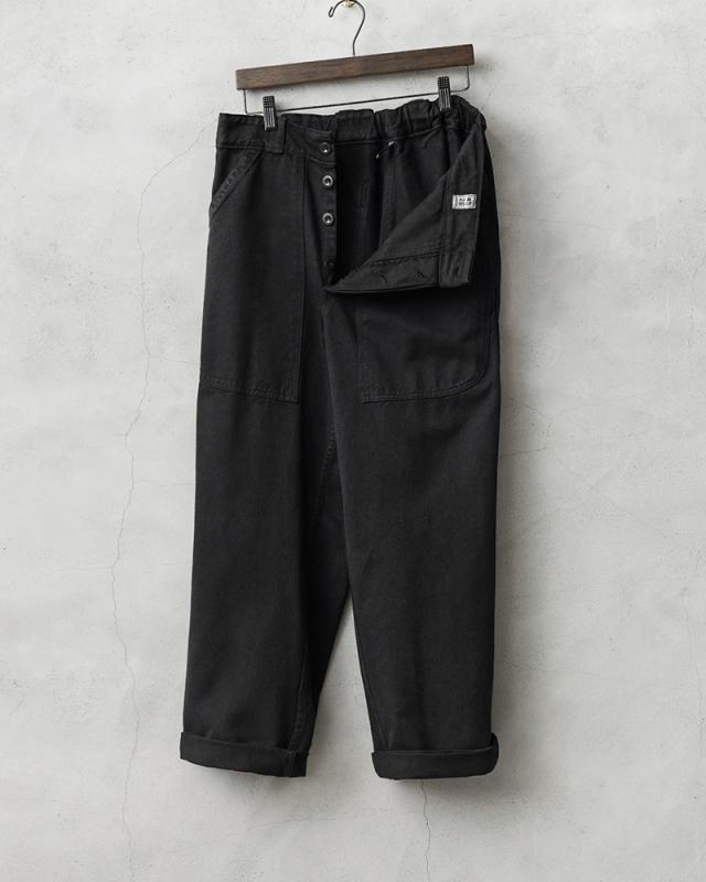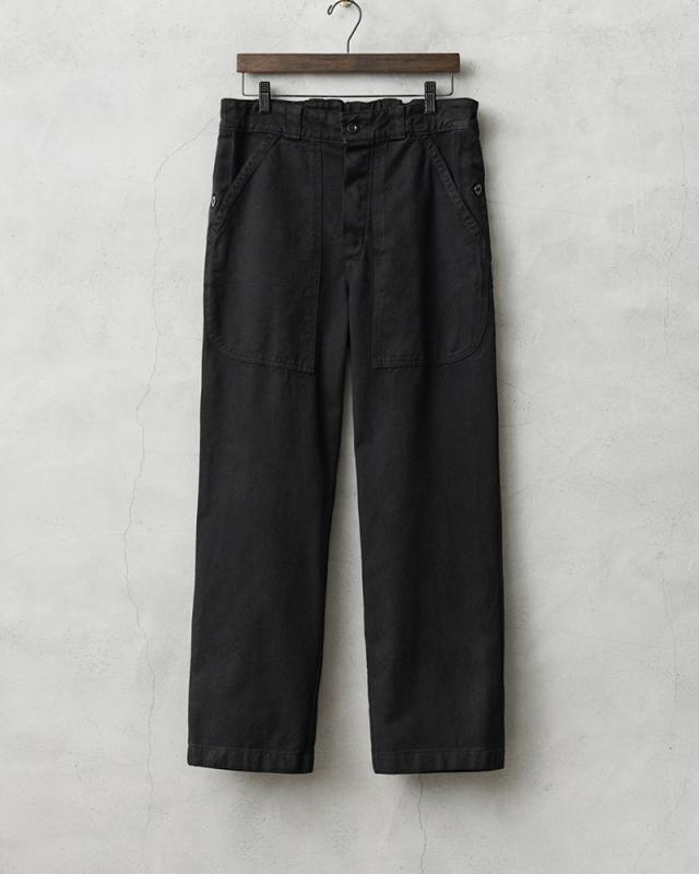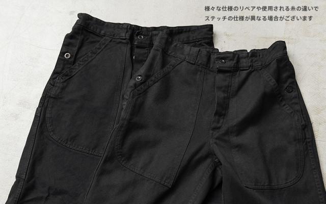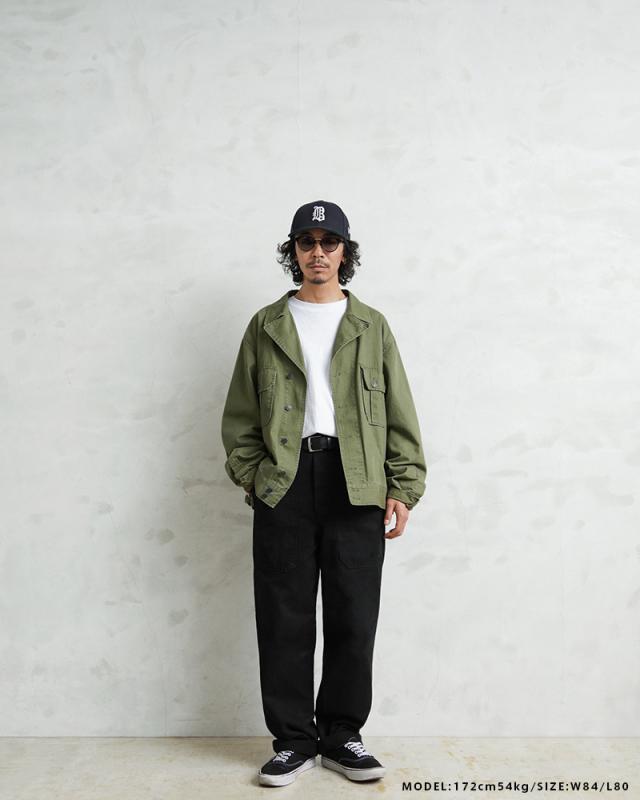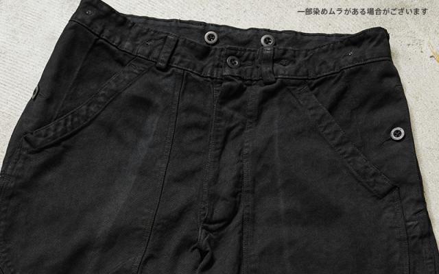 年代によってボタンに違いがあり、通称前期型と呼ばれたアルミボタンタイプのものに対し、こちらはプラスチック製の樹脂ボタンを採用した通称後期型となります。今回、この希少性が高いアイテムを国内で丁寧に黒染めしました。本来のがっしりとした質感に、後染めの効果も加わり、非常に雰囲気のある仕上がりに。これからまた履き込むほどにアタリや色落ちが出て、経年変化が非常に楽しみなアイテムです。