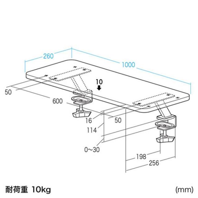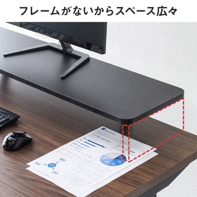 液晶ディスプレイの位置を上げることで、目線を高くして姿勢をよくし、ディスプレイ全体を見やすくできます。ディスプレイ下のスペースを有効活用できます。クランプ式の固定なので昇降デスクなどの動作がある物にも安心して取付けできます。前面にフレームがないのでより空間を広く使うことができます。クランプ位置は5cm間隔で2ケ所止め位置があるので万が一干渉物があっても調整ができます。W1000mmでディアルモニターの設置にも最適です。