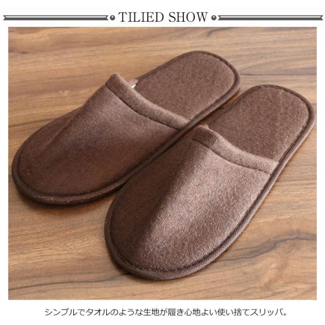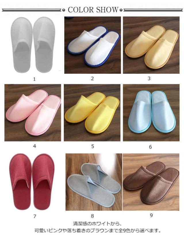 | シンプルでタオルのような生地が履き心地よい使い捨てスリッパ。 1足ずつ包装しておりますので、旅行や出張など時携帯便利で、かさばらない。 普段使い、来客用、旅行用など一般ユーザー様のご利用はもちろん、ホテルや旅館・エステ・医療福祉施設などの業務用としても広くご愛用頂いております。 新幹線、自動車、飛行機などの移動中に、靴を脱いでリラックスする時に大活躍する携帯便利な使い捨てスリッパ。 底は凸凹加工の滑りにくいEVA素材を使用しています。 清潔感のホワイトから、可愛いピンクや落ち着きのブラウンまで全9色から選べます。 | |