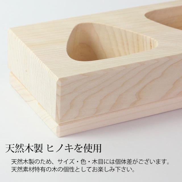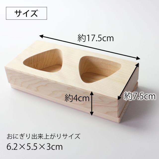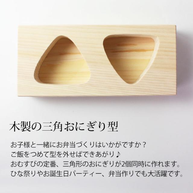 日本製(国産)おにぎり おむすび 木製 型 三角おにぎり 2ツ穴 2個 敷板付 おにぎりメーカー お弁当 押し型 型抜き 型枠 おにぎり器 さんかく おにぎり ヒノキ 檜 幼稚園 園児 小学生 こども 遠足 運動会 行楽 無塗装 時間短縮 便利グッズ 日本製