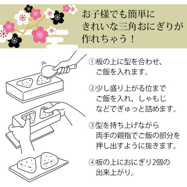 | 商品説明 | お子様と一緒にお弁当づくりはいかがですか? ご飯をつめて型を外せばできあがり。 おむすびの定番、三角形のおにぎりが2個同時に作れます。 ひな祭りやお誕生日パーティー、弁当作りでも大活躍です。 |