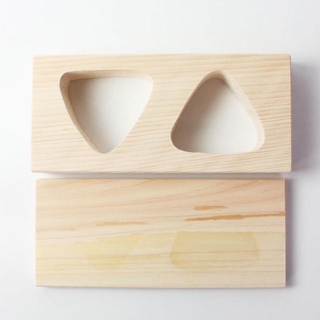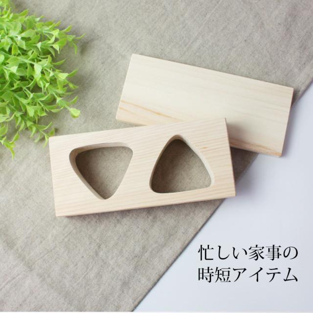 おにぎり おむすび 木製 型 三角おにぎり 2ツ穴 2個 敷板付 おにぎりメーカー お弁当 押し型 型抜き 型枠 おにぎり器 さんかく おにぎり ヒノキ 檜 幼稚園 園児 小学生 こども 遠足 運動会 行楽 無塗装 時間短縮 便利グッズ 日本製 k_name