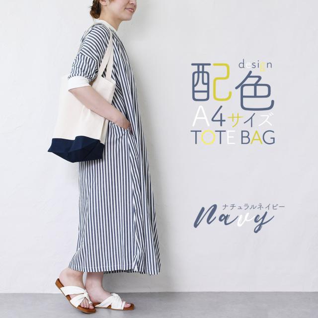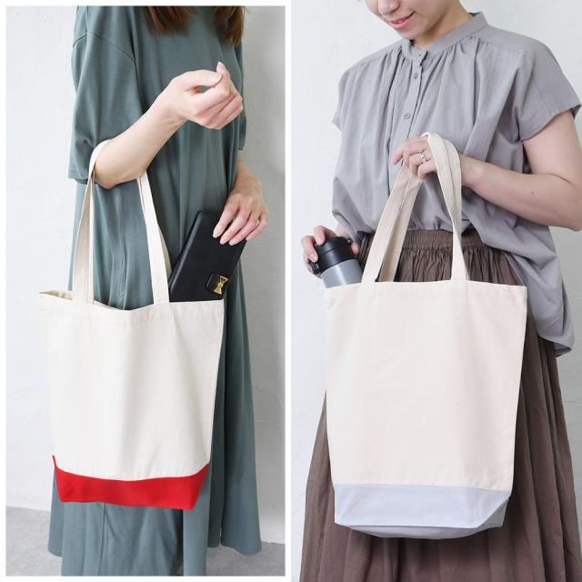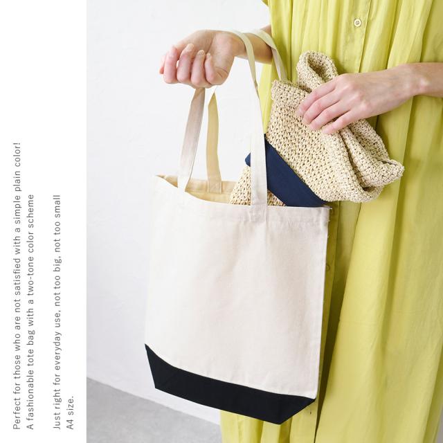 シンプルな無地じゃ物足りない方にピッタリ!ツートンの配色がオシャレなトートバッグ。普段使いにちょうどいい、大きすぎず、小さすぎないA4サイズ。手持ちも肩掛けもできる2wayタイプです。お弁当・水筒・財布・コスメポーチ・折り畳み傘・A4サイズのノートや雑誌など持ち運びたい小物がたっぷり入ります。
