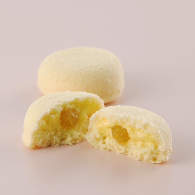 カスタードクリーム入りのとっておきのふんわりケーキです。カスタードクリ—ムは卵の風味をいかし、なめらかでとろーりとした食感。中心には果肉入りアップルソースを閉じ込めています。りんごのシャキシャキ感をお楽しみいただけます。デザートタイムや来客用など様々なシーンでお楽しみください。