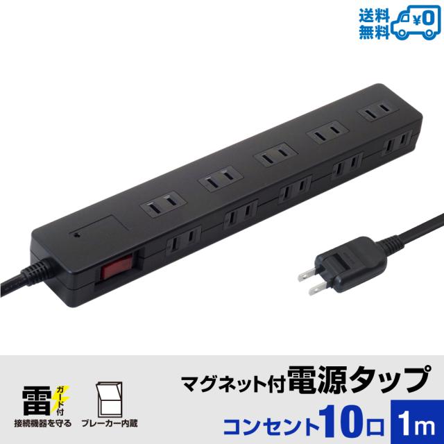 【送料無料】STYLED マグネット付電源タップ コンセント×10口 電源コード1m 18ヵ月保証 雷ガード ブレーカー 一括集中スイッチ マグネット OAタップ 延長コード ブラック STP10B-1