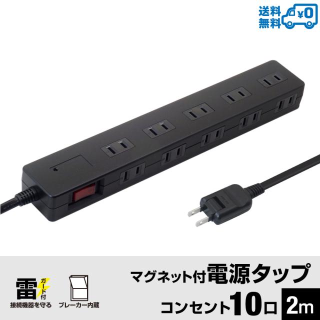 【送料無料】STYLED マグネット付電源タップ コンセント×10口 電源コード2m 18ヵ月保証 雷ガード ブレーカー 一括集中スイッチ マグネット OAタップ 延長コード ブラック STP10B-2