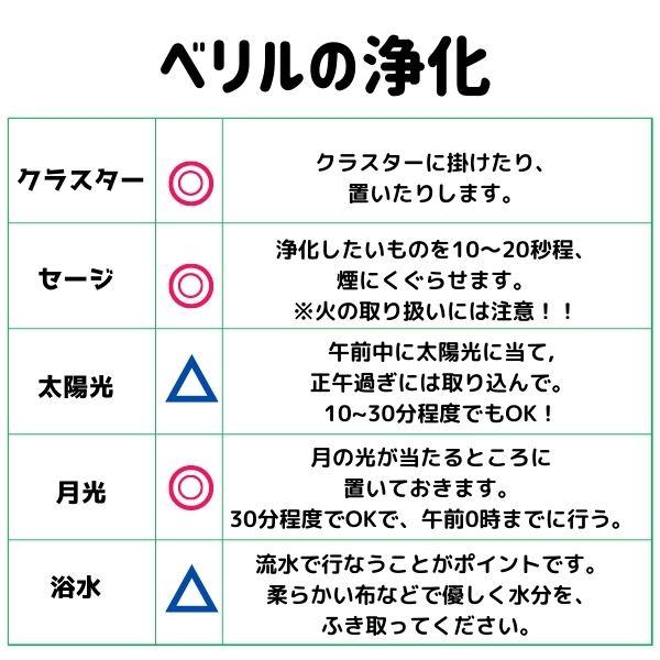 ベリルの色あいによっては、長時間の太陽光によって褪色することがありますので、積極的に太陽光で浄化をするのは避けたほうが良いでしょう。