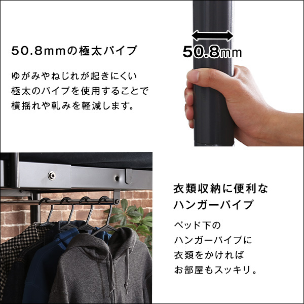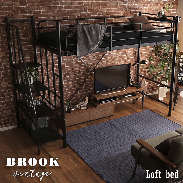 BROOK 階段付きヴィンテージロフトベ ッド (ロフトベッド ヴィンテージ 階段 高さ調節 ハイタイプ ロータイプ コンセント 宮棚 極太パイプ メッシュ床 通気性 寝返りストッパー ハンガーパイプ おしゃれ おすすめ)