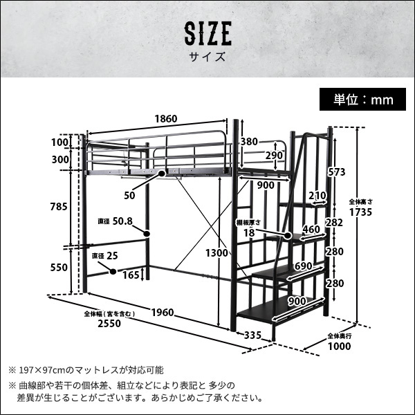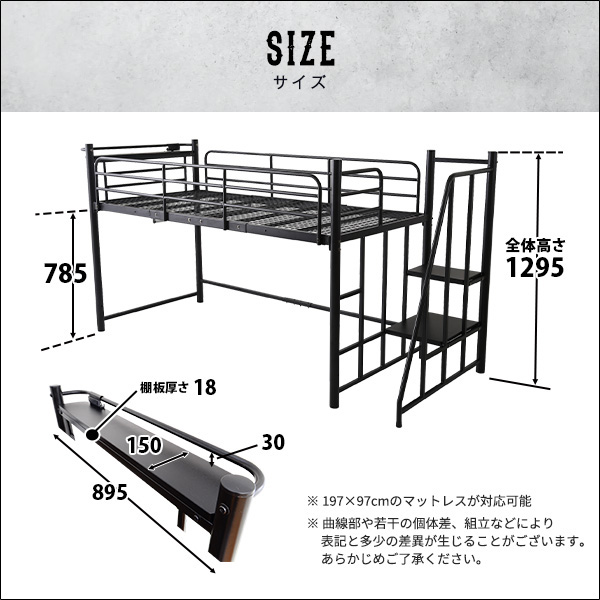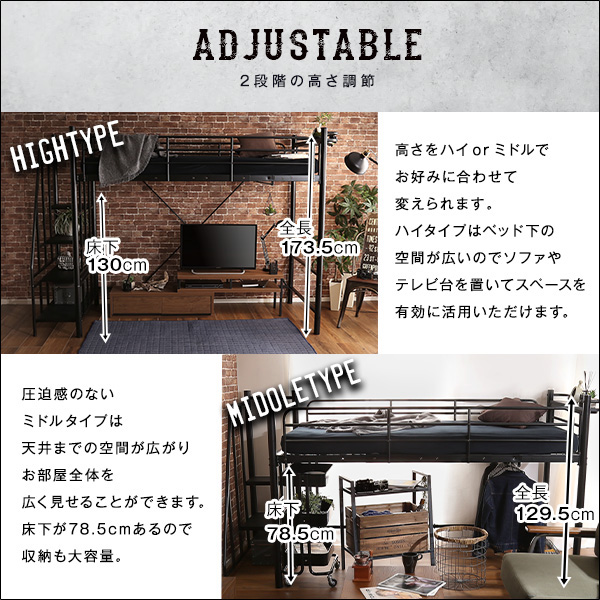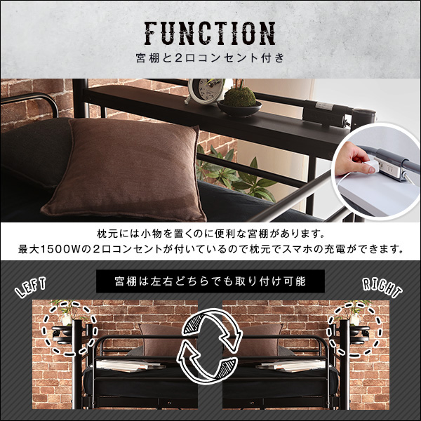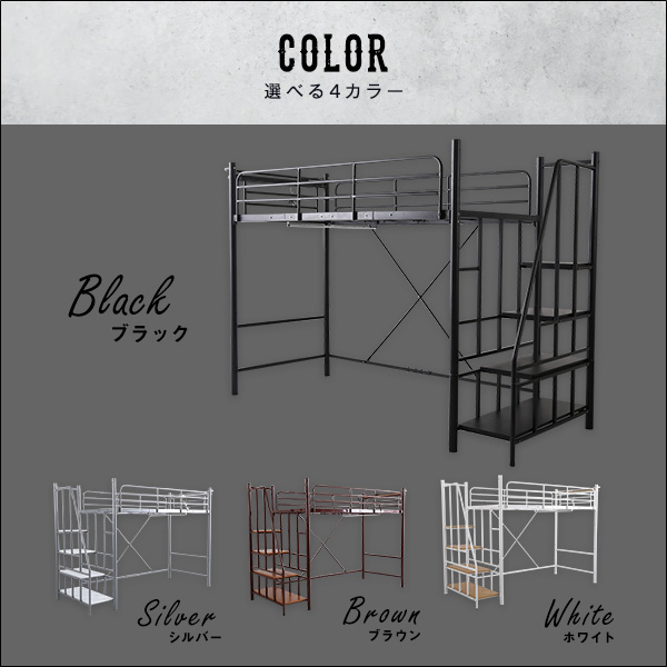 | 説明 | 階段付きヴィンテージロフトベッド【BROOK】 階段は左右どちらでも取付け可能なので、お部屋に合わせてレイアウト自由! ハイタイプ・ミドルタイプに高さ調整可能! さらにコンセント付きの宮棚付き! 極太パイプを採用でさらに安心・安全! |