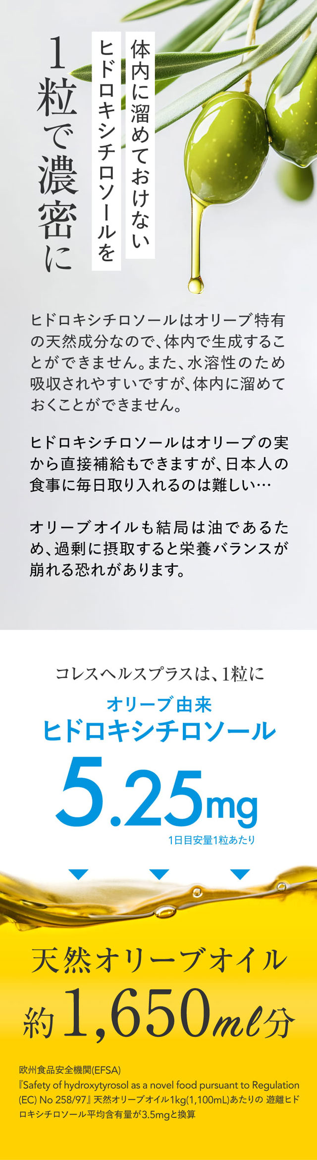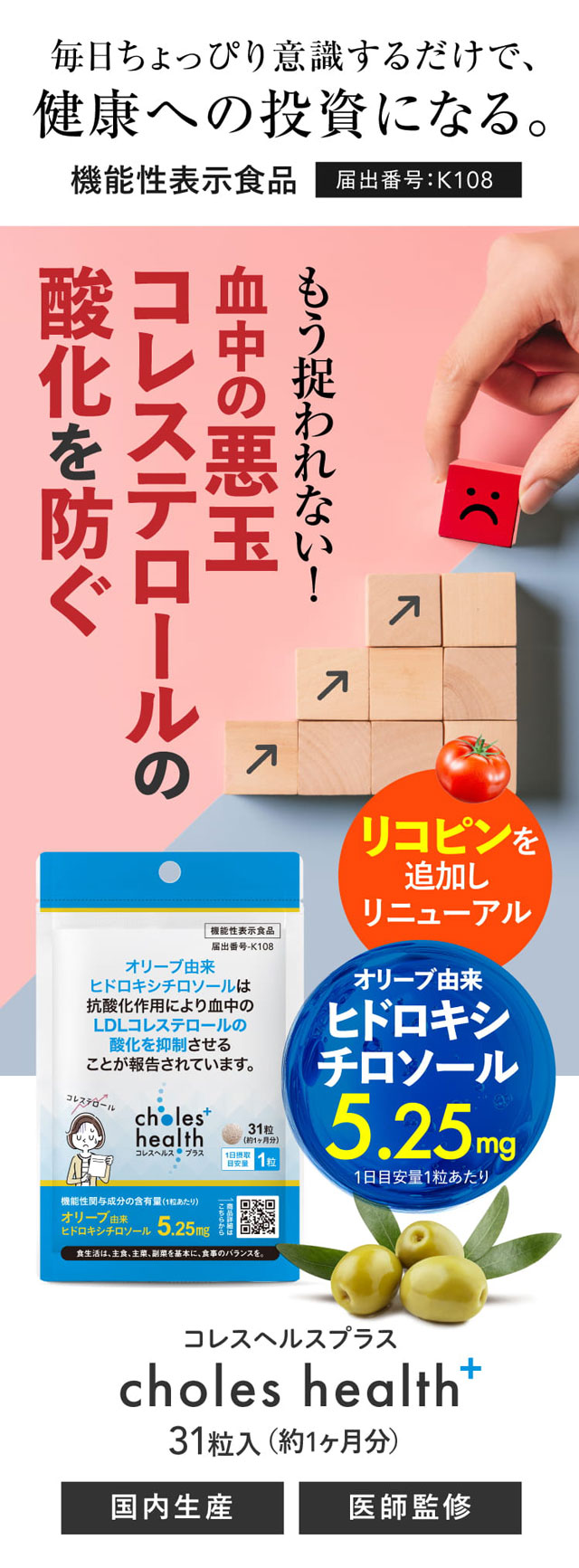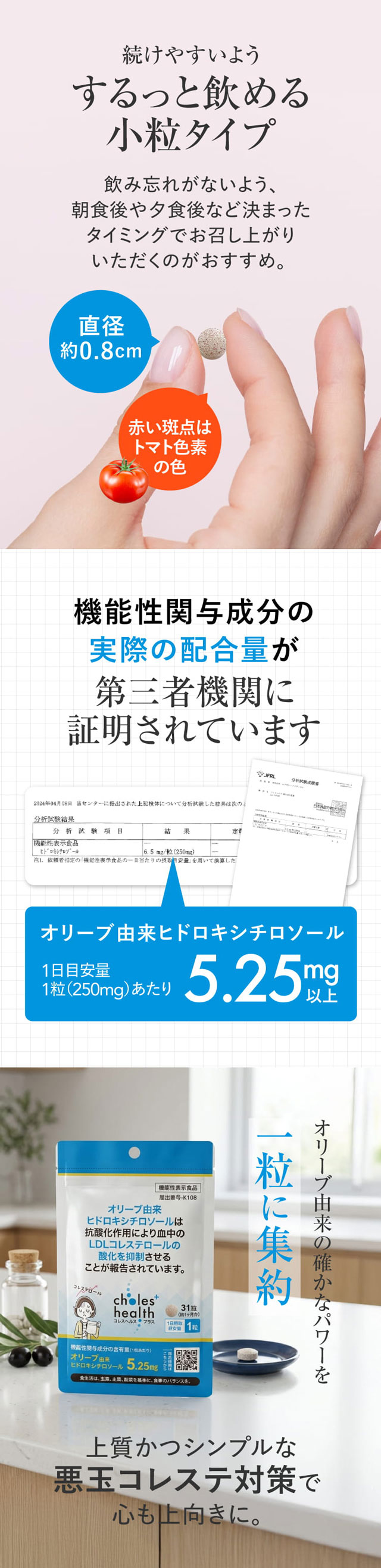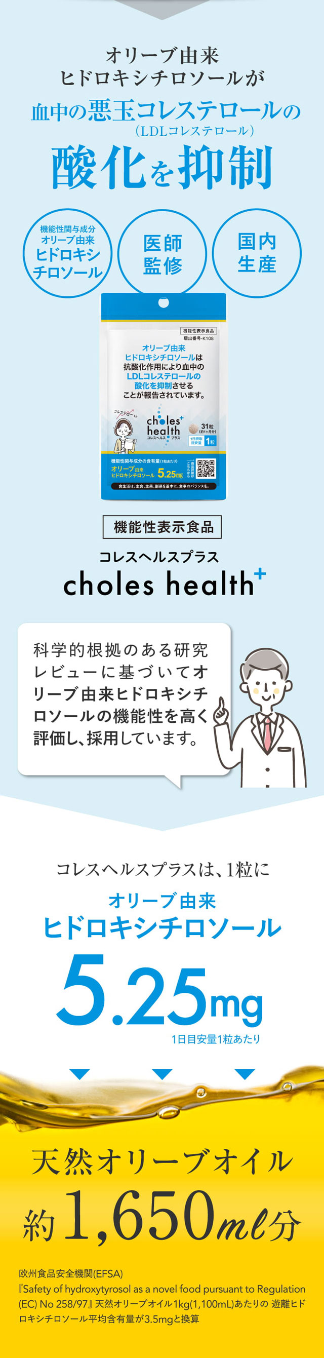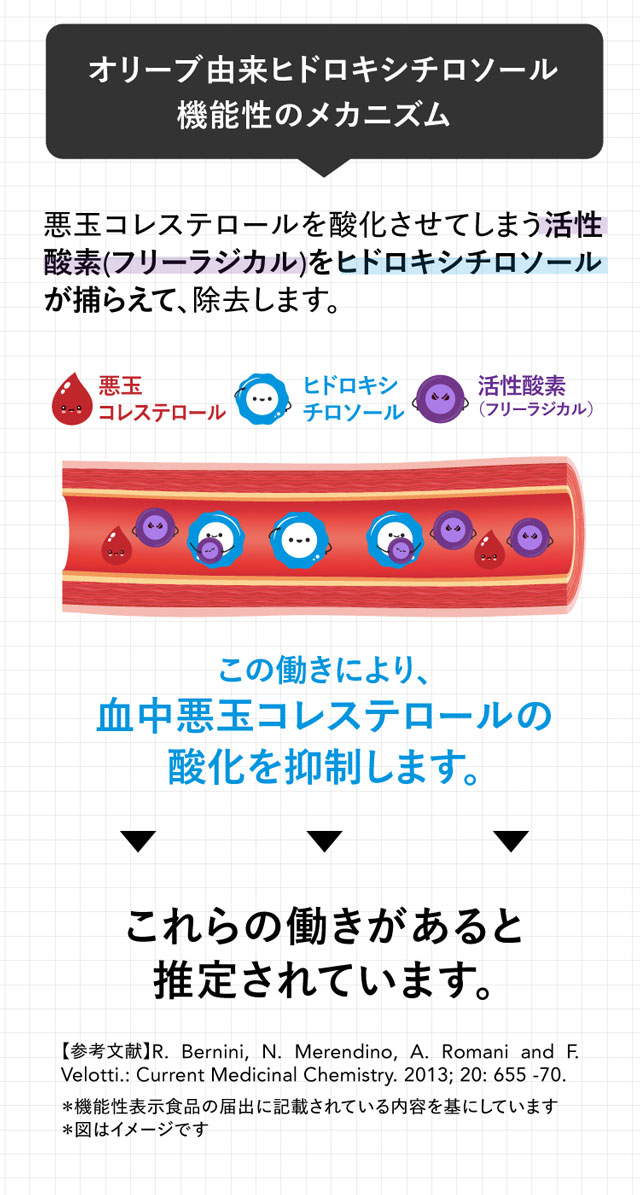 血中の悪玉コレステロール(LDLコレステロール)の酸化を防ぐ機能性関与成分『オリーブ由来ヒドロキシチロソール』配合の機能性表示食品。<国内製造><医師監修>