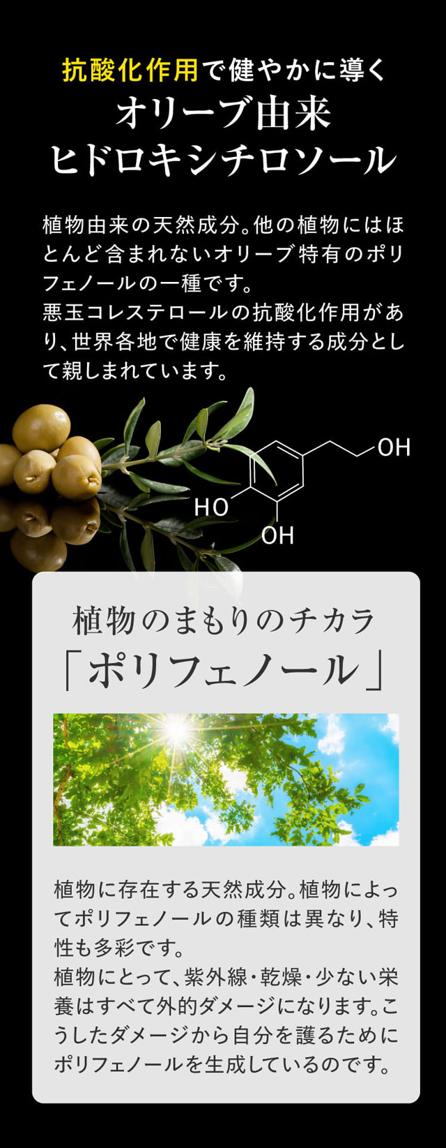 【ヒドロキシチロソール】は体内生成・貯蓄ができないので、こまめに効率的に摂取することが大切です。