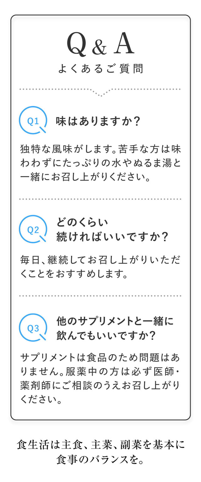 | 摂取上の注意 | ●本品は、多量摂取により疾病が治癒したり、より健康が増進するものではありません。 ●原材料名(ここをクリックし)をご確認のうえ、食物アレルギーのある方はお召し上がりにならないでください。 ●天然原料を使用しておりますので、まれに変色することがございますが、品質上問題ありません。 ●まれに体調や体質により合わない場合がありますので、その場合はご使用を中止してください。 ●乳幼児の手の届かない場所に保存してください。 |