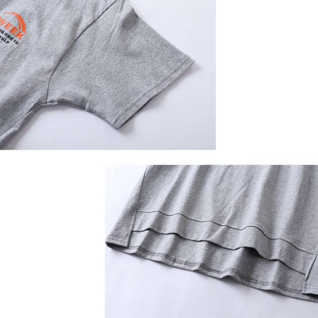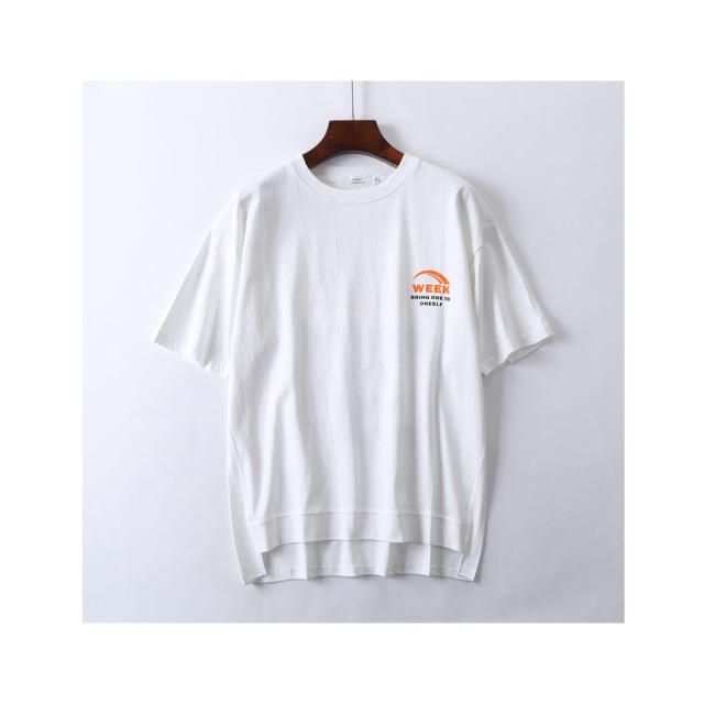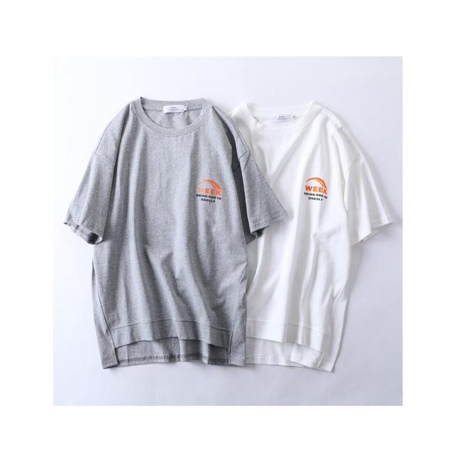 英字のシンプルなロゴが背中に入った半袖Tシャツ後身頃を長くした、後ろ下がりのデザインで動きのあるスタイルは